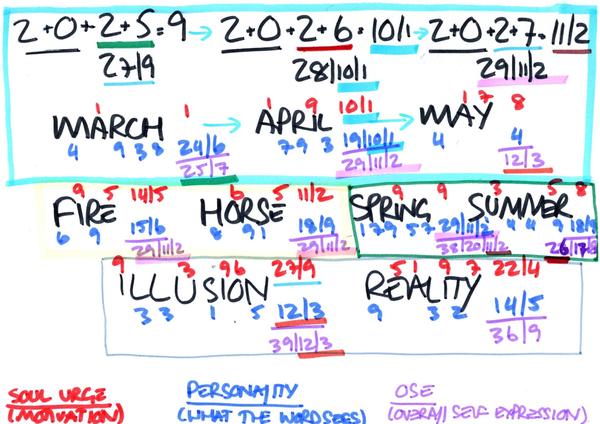The numbers assigned to the letters in the word ‘March’ add up to 25/ 7 (Overall Self Expression OSE). In numerology this represents a potential Birth of Consciousness (25/ 7).